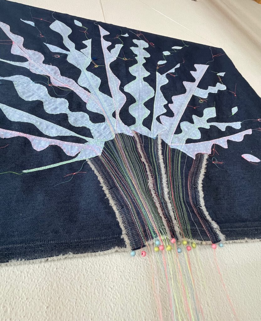 Titel „Kopf-Weide“ – Material Baumwollstoff (altes Herrenhemd) auf Jeans mit Neonfäden genäht + geklebt – Format 100x70cm